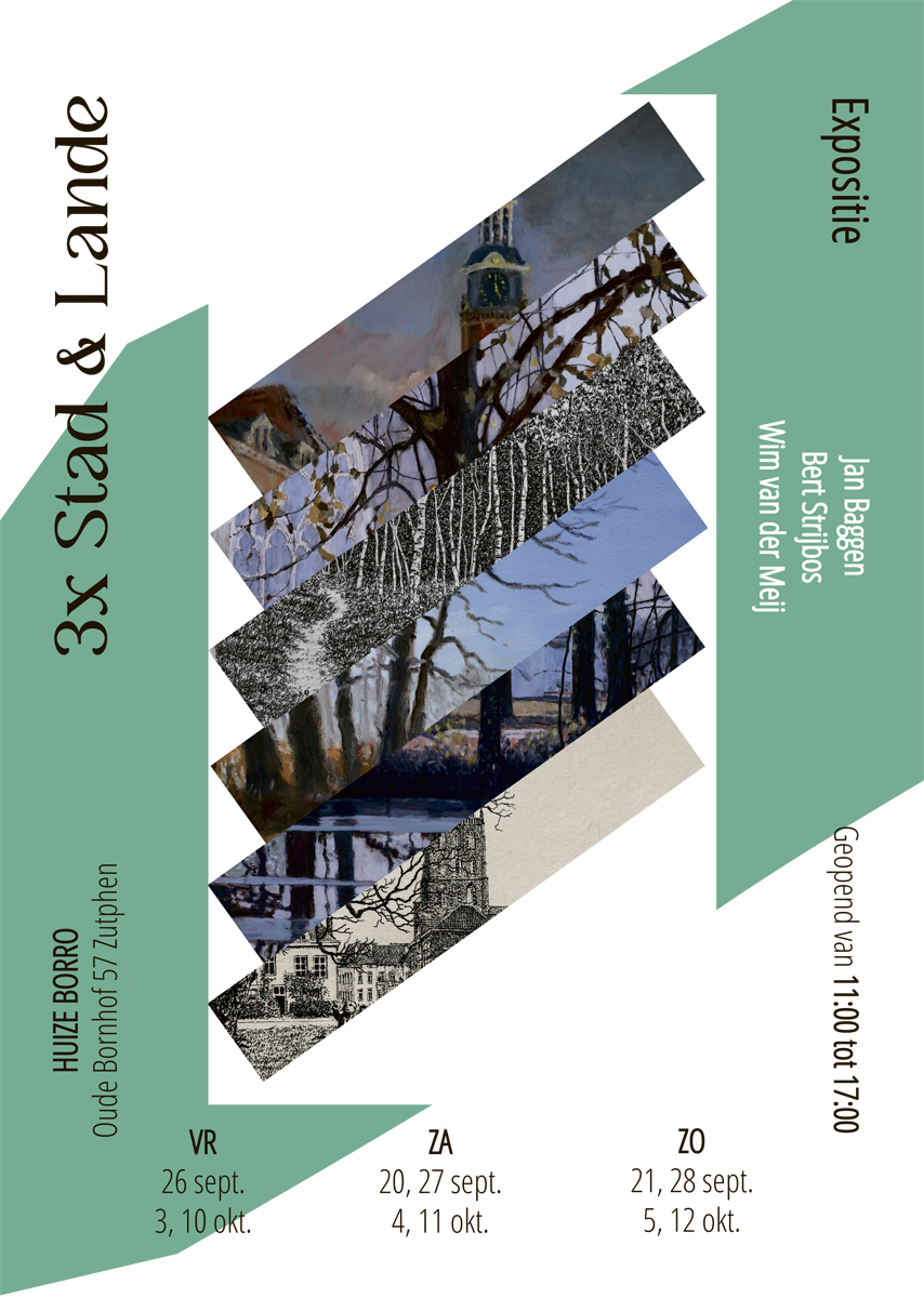 In Huize Borro exposeren drie uitzonderlijke Zutphense kunstenaars in de weekeinden van 20 september tot 12 oktober hun werk dat in en rond Zutphen tot stand kwam. Wat hen bindt en waar hun schilderijen, etsen en tekeningen van getuigen is hun liefde voor de stad en haar omgeving!