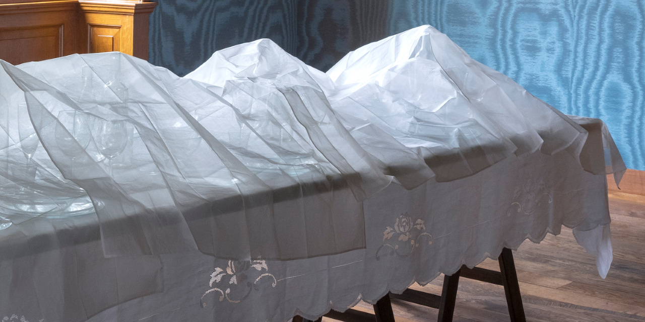 The dining table is een werk dat begint bij een persoonlijke herinnering van Lynne Leegte aan visites aan haar familie in Schotland. “Ik herinner me hoe ik door een kier in de deur een glimp opving van de eetkamer, waar een perfect gedekte tafel stond. Die aanblik riep dezelfde opwinding op als de avond voor een verjaardag, vol verwachting en magie. Een herinnering die zowel glashelder als ongrijpbaar blijft.”